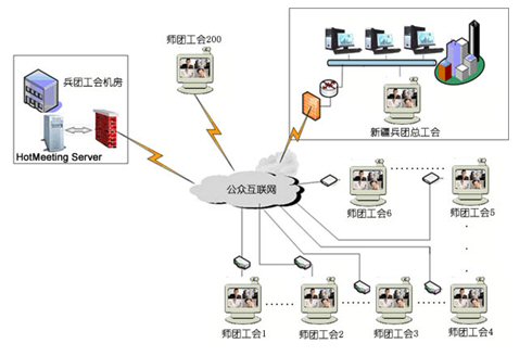 新疆建設兵團工會下設有14個師工會,111個團場工會.共有200個用戶同時參加視頻會議。中心服務器帶寬為100M光纖,各地終端通過網(wǎng)通2M寬帶接入,每個師、團級會場都有自己獨立的機房和會議室,適合進行基于IP網(wǎng)絡視訊會議的應用,在這個網(wǎng)絡平臺上,優(yōu)視(URSACOM)HotMeeting富媒體視頻會議系統(tǒng)所提供的高質(zhì)量的視頻圖像和方便易用的文檔、文件共享功能,使得兵團工會領導能夠在這個平臺上進行從桌面討論到會議室正式會議等各種規(guī)模應用。通過HotMeeting富媒體視頻會議系統(tǒng),除了進行全團工會系統(tǒng)例會,工作交流等常見的應用之外,遠程培訓等也是經(jīng)常進行的內(nèi)容。各個師、團工會系統(tǒng)能利用數(shù)據(jù)功能和兵團總工會協(xié)調(diào)業(yè)務,也能把平常培訓的會議材料進行詳細介紹,節(jié)約了以前培訓所花費的大量精力和時間。具體網(wǎng)絡拓撲見下圖: