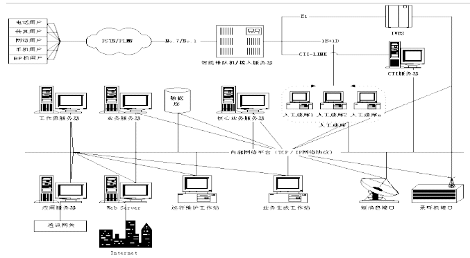 客戶服務中心系統(tǒng)包含智能排隊機(含接入服務器)、核心服務器CCS、交互式語音應答系統(tǒng)IVR、語音傳真服務器、業(yè)務服務器、工作流服務器、數據庫服務器、Internet/Intranet服務器、人工座席、尋呼機接口,手機短消息接口等組成。如下圖所示為Runsun呼叫中心系統(tǒng)結構圖: