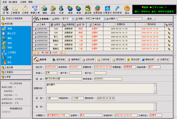 系統(tǒng)聯(lián)通了座席員、營業(yè)廳業(yè)務(wù)員、工程管理人員、維修網(wǎng)點派工人員、外勤維修人員、公司管理人員等各種角色使用系統(tǒng)的界面。