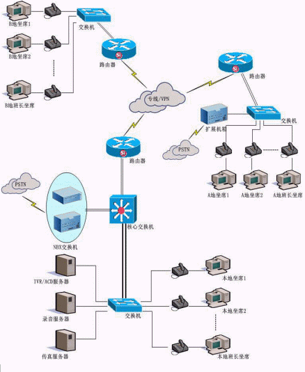 可以從不同的地區(qū)接入PSTN,即可以集中受理也可以通過(guò)由不同的坐席組分別受理。