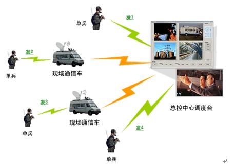 在具體應用中,工作人員(士兵)攜帶單兵背負終端深入現(xiàn)場(災區(qū)、廣場、戰(zhàn)場等),將現(xiàn)場視頻實時回傳到后方的應急通信車或指揮中心,同時現(xiàn)場人員可以和指揮中心建立雙向語音通信,指揮中心根據(jù)現(xiàn)場真實的視頻信息并結合現(xiàn)場人員語音匯報,可以做出更有針對性、更具準確性的指揮決策。