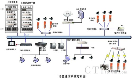 整體解決方案由軟交換服務器、會議服務器、錄音服務器、數(shù)字中繼網(wǎng)關、調度臺、有線對講模塊、有線廣播模塊、無線對講模塊等幾部分組成,系統(tǒng)基于IP網(wǎng)絡部署,所有設備均直接接入到IP網(wǎng)絡上,通過IP網(wǎng)絡匯聚到指揮中心進行交換和統(tǒng)一管理調度。