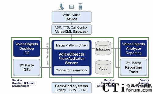 VoiceObjects體系結(jié)構(gòu)支持輕松地開發(fā)、部署和維護(hù)帶有語音、視頻、文本和移動互聯(lián)網(wǎng)接口的電話應(yīng)用。通過緊密集成提供實(shí)時分析的VoiceObjects分析器和提供應(yīng)用創(chuàng)建與維護(hù)的VoiceObjects桌面,VoiceObjects服務(wù)器成為提供動態(tài)對話和接口生成的執(zhí)行引擎。