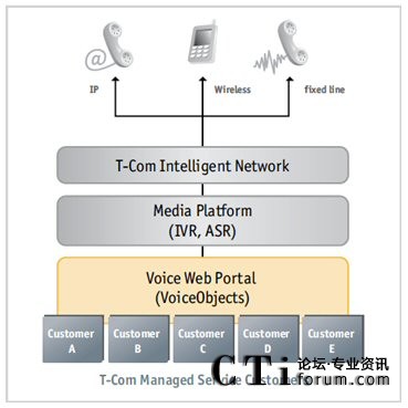 T-Com在2000年進(jìn)入競(jìng)爭(zhēng)激烈的受托管理業(yè)務(wù)市場(chǎng),并且很快從一個(gè)自產(chǎn)IVR系統(tǒng)過渡到開放標(biāo)準(zhǔn)的VoiceXML平臺(tái)。T-Com的標(biāo)語(yǔ)——“讓生活簡(jiǎn)單”——證明了要求給它的客戶及其每天1,000,000個(gè)呼叫提供7x24、可擴(kuò)展的和可靠的受托管理電話服務(wù)。但是,T-Com很快意識(shí)到需要額外的技術(shù)來補(bǔ)充這個(gè)新的VoiceXML平臺(tái)。