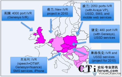 WEB和語音等渠道的整合;第二,為客戶提供簡單直觀的自助服務選項;第三,便捷部署業(yè)務,快速分析客戶行為,調整業(yè)務方式。VoiceObjects成功克服這三個挑戰(zhàn),在歐洲T-Mobile贏得多個國家的份額,并且有不斷增長的趨勢。