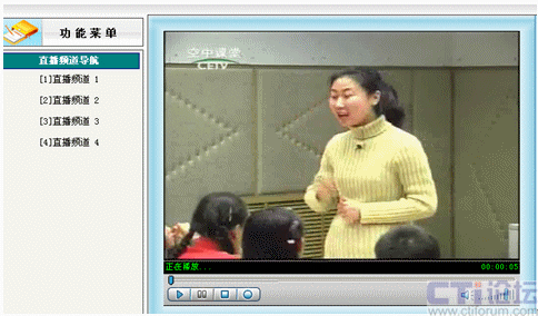 先在直播系統(tǒng)里啟動(dòng)設(shè)置好的01號(hào)頻道,其他教師就可以在各自辦公室通過(guò)計(jì)算機(jī)網(wǎng)絡(luò)觀看遠(yuǎn)教節(jié)目,不需淘神費(fèi)力地到專門的接收室了。如下圖: