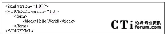 所有VoiceXML命令都封裝在……之間。VoiceXML對話框用戶描述腳本對用戶輸出的各種提示、定義和收集用戶的響應(yīng),并且描述程序控制的流程。對話框分兩種,分別是窗體(forms)和菜單(menus)。窗體輸出信息并且收集輸入,菜單提供下一步做什么選擇。這個例子有一個單一的窗體,它包括一個快(block),該塊合成并輸出“Hello World!”。由于這個窗體沒有后繼的對話框,所以輸出完“Hello World!”后,腳本結(jié)束。
