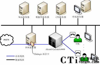 整個(gè)呼叫中心分存在兩種通訊方式:語(yǔ)音方式和數(shù)據(jù)方式。語(yǔ)音方式指的是傳統(tǒng)的電話線路,數(shù)據(jù)方式則是指的是各個(gè)應(yīng)用程序間的通訊交互線路。管理語(yǔ)音硬件的有Dialogic語(yǔ)音卡—負(fù)責(zé)整個(gè)系統(tǒng)的語(yǔ)音接入,并處理自動(dòng)語(yǔ)音的相關(guān)動(dòng)作;Alcatel-lucent A4400—阿爾卡特語(yǔ)音交換機(jī)產(chǎn)品,負(fù)責(zé)處理話路相關(guān)的操作,如:轉(zhuǎn)接、咨詢、路由等。管理應(yīng)用程序的服務(wù)器有IVR服務(wù)器—管理整個(gè)IVR系統(tǒng),主要是本文設(shè)計(jì)的執(zhí)行引擎運(yùn)行在這個(gè)服務(wù)器中;Web服務(wù)器—分為兩個(gè)部分:第一是IVR系統(tǒng)流程的發(fā)布,第二是整個(gè)企業(yè)Web系統(tǒng)的發(fā)布;數(shù)據(jù)庫(kù)服務(wù)器—所有系統(tǒng)相關(guān)的數(shù)據(jù)庫(kù)存儲(chǔ)于這臺(tái)服務(wù)器,使用的數(shù)據(jù)庫(kù)產(chǎn)品是SQL Server 2005;CTI服務(wù)器—是這個(gè)呼叫中心的樞紐,它控制著語(yǔ)音線路,掌握著呼叫中心各個(gè)模塊,如:ACD、路由、坐席配置等的正常工作,平臺(tái)采用的是著名的CTI產(chǎn)品Genesys Express 4.5;終端服務(wù)器—對(duì)整個(gè)呼叫中心各個(gè)組件的終端管理,IVR系統(tǒng)的流程定義工具、CTI系統(tǒng)的配置工具和監(jiān)控工具和其它應(yīng)用的客戶端都安裝在這臺(tái)服務(wù)器中。