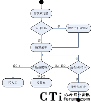 除了以上功能以外,IVR系統(tǒng)還需要處理電話留言的流程,該流程是通過(guò)IVR系統(tǒng)轉(zhuǎn)入坐席以后,有CTI系統(tǒng)判斷如果沒(méi)有空閑的坐席且時(shí)間超過(guò)60秒,自動(dòng)轉(zhuǎn)回到IVR系統(tǒng),同時(shí)向IVR系統(tǒng)發(fā)送標(biāo)志表示此通呼叫是CTI轉(zhuǎn)入IVR系統(tǒng)。IVR系統(tǒng)在接收到這個(gè)標(biāo)志后,進(jìn)入電話留言流程。