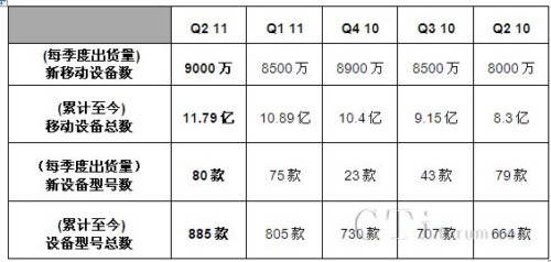 2011年第二季度啟用Red Bend方案的設(shè)備: