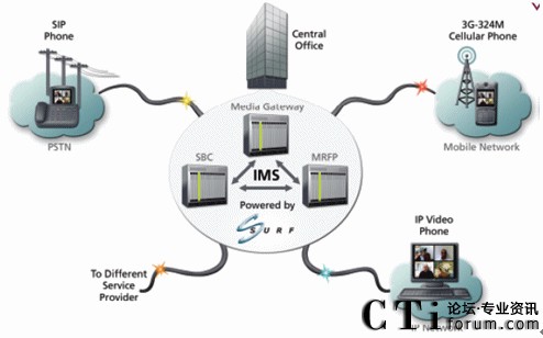 下圖顯示了 Surf 的統(tǒng)一通信平臺(tái)如何融合PSTN、 3G(3.5G)移動(dòng)網(wǎng) 和 IP 這三種網(wǎng)絡(luò)。