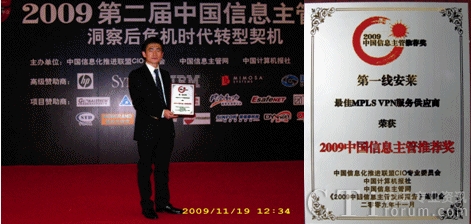 CTI論壇(ctiforum)11月25日消息(記者 張塵):2009年11月19日,2009年中國(guó)信息主管年會(huì)在北京世紀(jì)金源大飯店盛大召開,會(huì)議共吸引了各行業(yè)千名CIO線上與線下的參與。作為中國(guó)CIO云集的高峰會(huì)議,第一線安萊全程參與了本次大會(huì),從產(chǎn)品方案與展示等方面向業(yè)界展示了第一線安萊10年多來在MPLS VPN服務(wù)領(lǐng)域的最佳實(shí)踐經(jīng)驗(yàn)與卓越的市場(chǎng)領(lǐng)導(dǎo)地位,贏得了各與會(huì)嘉賓及CIO們的普遍認(rèn)同和稱贊。