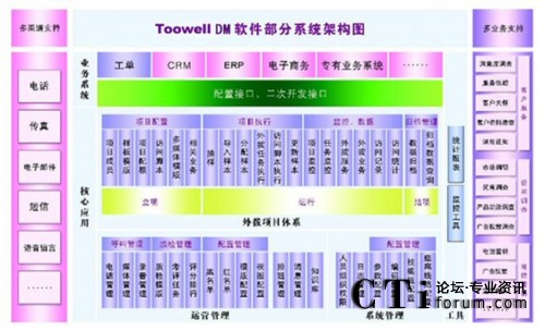 - Toowell DM 具備強(qiáng)大的業(yè)務(wù)整合能力,軟件框架基于呼叫中心全方位解決方案,支持訂單、投訴、業(yè)務(wù)開通、知識(shí)管理等。