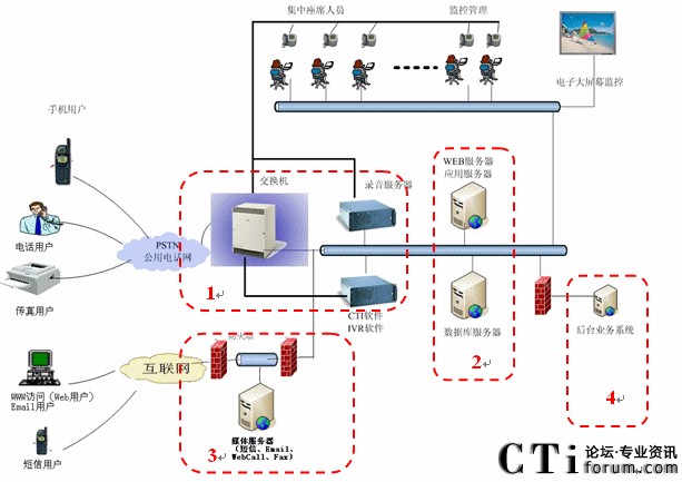 基于PBX交換機(jī)實(shí)現(xiàn)語音交換和ACD排隊(duì)、基于板卡實(shí)現(xiàn)語音資源、基于CTI中間件實(shí)現(xiàn)CallCenter功能、基于先進(jìn)技術(shù)實(shí)現(xiàn)增強(qiáng)功能,共同搭建呼叫中心平臺(tái)。