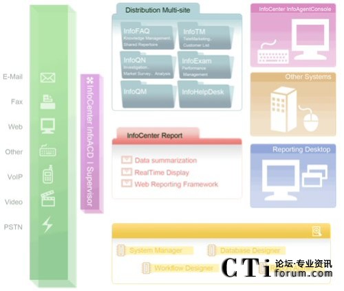 由于今日的客服中心已是多媒體的客服中心,不再只有單純的電話進線,客戶尋求服務(wù)的管道更多樣化,InfoCenter Total Solution可以完全整合應(yīng)用程序、數(shù)據(jù)倉儲系統(tǒng)、多媒體溝通互動管道,藉由不同的系統(tǒng)達到分析與處理客戶需求,并且達到一致性的工作流程管理,提供更高質(zhì)量的服務(wù)。
