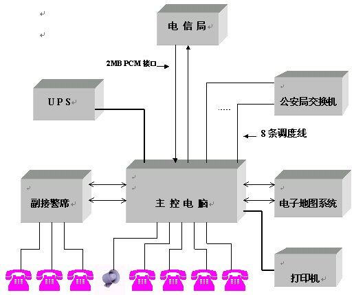 電信局交換機提供單獨數字2MB PCM中繼接口,通過HDSL傳輸設備或光端機設備將中繼接口連接到公安局指揮中心。若電信局與公安局距離小于500米,則可直接使用75歐姆電纜將中繼接口連接到公安局指揮中心。 該數字2MB PCM中繼接口的數據可以作成110/119/122混合編程,數據采用收全碼方式,被叫控制掛機。