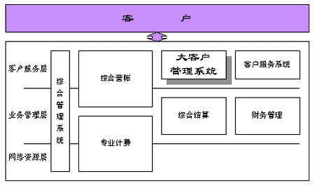 綜合電信業(yè)務服務支撐系統(tǒng)由專業(yè)計費、綜合營帳、綜合客服、綜合結算和統(tǒng)一客戶資料等系統(tǒng)組成。其中的大客戶服務系統(tǒng)是電信運營商面向大客戶提供服務的接口,通過大客戶市場開拓、大客戶信息收集及管理、大客戶服務及營銷、企業(yè)決策支持等一系列的活動,實現(xiàn)方便、快捷、高品質的大客戶服務。