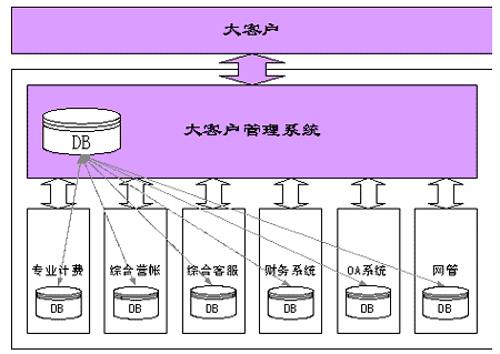 電信企業(yè)大客戶管理系統(tǒng)是電信企業(yè)信息系統(tǒng)中的一個組成部分,與其它業(yè)務系統(tǒng)如大客戶服務系統(tǒng)、綜合營帳、財務系統(tǒng)、計費系統(tǒng)、OA系統(tǒng)、網(wǎng)管系統(tǒng)等都有著不可分割的聯(lián)系,它需要從這些系統(tǒng)中提取相應的數(shù)據(jù)并且把相應的數(shù)據(jù)傳輸?shù)狡渌到y(tǒng),或者和這些系統(tǒng)一起完成系統(tǒng)的某些重要功能,如合同跟蹤等。而且大客戶管理系統(tǒng)也會極大影響各個業(yè)務系統(tǒng)的運行,大客戶系統(tǒng)與相關系統(tǒng)之間的關系如下圖所示: