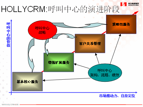 其次,我們認(rèn)為企業(yè)呼叫中心的建設(shè)不可能一次到位,而是一個(gè)持續(xù)改進(jìn)和不斷完善的過程。企業(yè)建設(shè)呼叫中心將是一個(gè)分階段分步驟的建設(shè)過程,將在其規(guī)劃的呼叫中心戰(zhàn)略的指引下和呼叫中心架構(gòu)、流程和績(jī)效的支撐上會(huì)經(jīng)歷基本核心服務(wù)、增強(qiáng)擴(kuò)展服務(wù)、客戶關(guān)系管理和策略性服務(wù)等幾個(gè)主要的階段,這就需要前期做好整體規(guī)劃,然后分階段實(shí)施,確保前期投資在后期依然可用就非常重要了,具體如下圖所示: