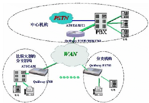 。。如圖是一個典型的企業(yè)網(wǎng)IP電話組網(wǎng)方案,在總部采用Quidway®R3640E/3680E路由器作為中心語音網(wǎng)關設備,在E1線路上實現(xiàn)VoIP功能;如果機構規(guī)模不是很大,也可以采用AT0/E&M連接PBX;在各分支機構及網(wǎng)點,則可采用Quidway® R1760連接PBX或普通電話,實現(xiàn)語音信號在傳統(tǒng)電路交換網(wǎng)絡和IP網(wǎng)絡之間的轉換,為企業(yè)提供高質量、低費用的語音互聯(lián)。