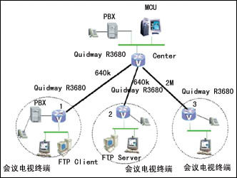 對于視頻的互通,則采用專用的視頻網(wǎng)關(guān),在中心處配置一臺MCU作為整個(gè)網(wǎng)絡(luò)視頻系統(tǒng)的管理者,1、2、3節(jié)點(diǎn)則配置具有視頻網(wǎng)關(guān)功能的視頻終端。在網(wǎng)上召開視頻會(huì)議時(shí),各會(huì)場的加入和畫面的調(diào)度都由位于中心的MCU進(jìn)行控制。通過視頻網(wǎng)關(guān)壓縮的圖像的帶寬為512kbps。