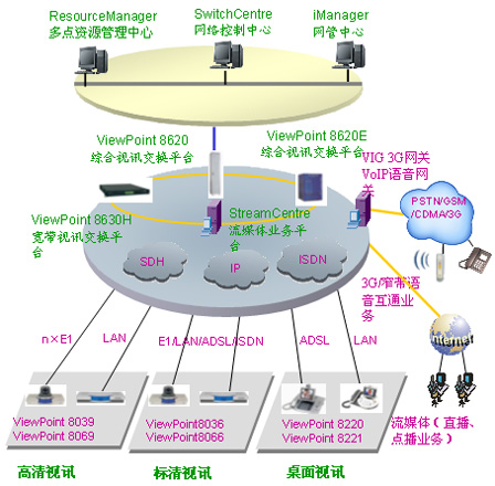 華為公司針對(duì)企業(yè)多媒體通信的實(shí)際需求,推出了高清晰視訊系統(tǒng)多媒體視訊通信解決方案,系統(tǒng)的組網(wǎng)結(jié)構(gòu)如下圖: