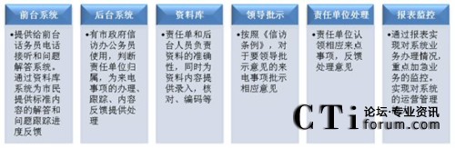 與其它政府熱線系統(tǒng)固化的功能設計不同,該方案可以靈活地定制業(yè)務模塊,方便深圳市12345公開電話系統(tǒng)根據(jù)自身市情市貌和需求,確定適合自身實際的功能組合。6組系統(tǒng)業(yè)務模塊完整地覆蓋了政府熱線的業(yè)務范圍與重點。該系統(tǒng)將政府熱線的業(yè)務分為前臺系統(tǒng)、后臺系統(tǒng)、資料庫、領導批示、責任單位處理和報表監(jiān)控等部分,貫穿了市民從咨詢、反映、投訴到建議的各個方面。為了準確反映業(yè)務狀況和系統(tǒng)運營,報表監(jiān)控模塊有力地支持了對系統(tǒng)進行運營管理工作。