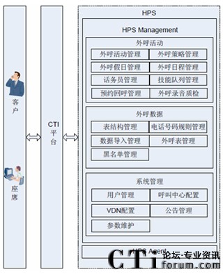 Server)提取HPS Management中導(dǎo)入的客戶數(shù)據(jù),自動(dòng)批量的執(zhí)行外呼任務(wù)。客戶呼通后,簽入HPS Agent 的話務(wù)員為客戶提供語音服務(wù)。