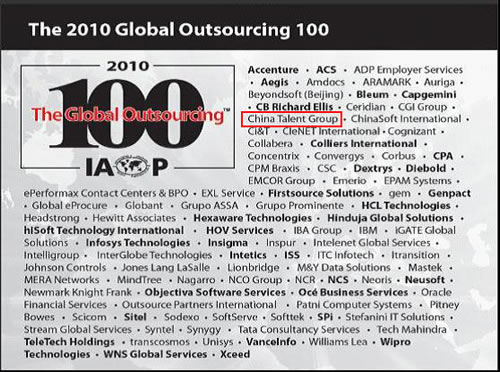 CTI論壇(ctiforum)5月11日消息(記者 楊佳林):近日,國(guó)際外包專業(yè)協(xié)會(huì)(IAOP)公布了2010年度“全球外包企業(yè) 100強(qiáng)(Global Outsourcing 100)”名單,國(guó)內(nèi)領(lǐng)先的人力資源外包服務(wù)商易才集團(tuán)(China Talent Group)成功入選該名單。這是易才集團(tuán)繼2009年首次參加Global Outsourcing 100評(píng)選,即獲得快速成長(zhǎng)之星、中國(guó)最佳外包企業(yè)等7個(gè)子項(xiàng)(sub list)殊榮后,2010年再度入圍“全球外包企業(yè)100強(qiáng)”,證明易才集團(tuán)已經(jīng)躋身國(guó)際頂尖外包企業(yè)行列。