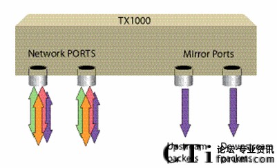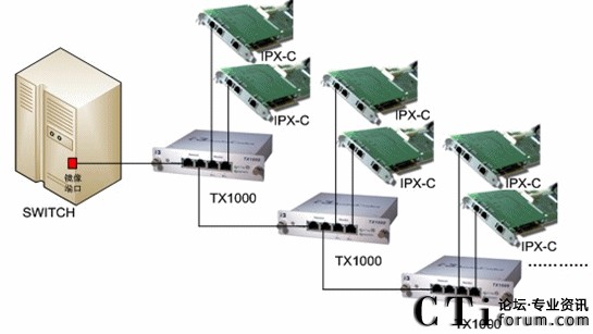 將PBX或網絡Switch的鏡像端口連接到TX1000的Network口,另一個Network口和Monitor 端口就可將一個端口的數(shù)據(jù)備份成三個端口的數(shù)據(jù),實現(xiàn)了一分三的功能。若再接一個TX1000,就可以繼續(xù)分用,以此類推,根據(jù)各個IP應用中實際所需的備份/分用,TX1000都可予以實現(xiàn)。