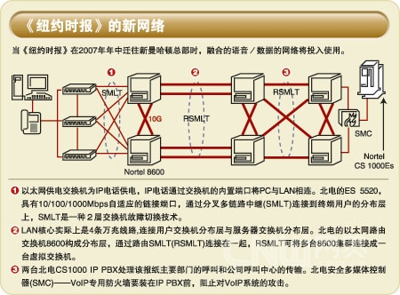 在離開自1913年就堆滿紙張的43號大街總部的同時,《紐約時報》也將離開基于Avaya專用分組交換機和電話,以及Cisco交換機和路由器的傳統(tǒng)語音/數(shù)據(jù)網(wǎng)。新辦公大樓中的網(wǎng)絡(luò)從局域網(wǎng)到數(shù)據(jù)中心及內(nèi)網(wǎng)核心均采用北電的設(shè)備!都~約時報》IT技術(shù)人員表示,由單廠商組建的網(wǎng)絡(luò)將為用戶提供更高的安全性、更容易的管理和更豐富的媒體功能。