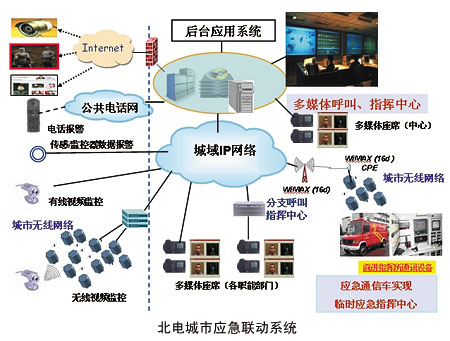北電的城市應(yīng)急系統(tǒng)是以光傳輸系統(tǒng)以及城市無(wú)線寬帶接入網(wǎng)絡(luò)為基礎(chǔ)的,集成了應(yīng)急指揮平臺(tái)、多媒體通信平臺(tái)、地理信息平臺(tái)等多種系統(tǒng)功能于一體的綜合解決方案。