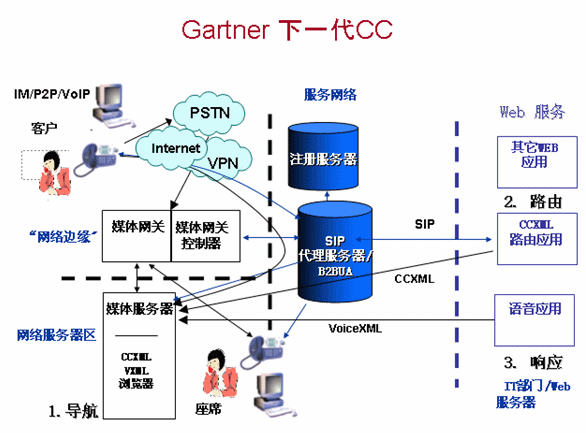 根據(jù)上圖,Gartner認(rèn)為下一代呼叫中心基于SIP架構(gòu),SIP開(kāi)放特性將賦予呼叫中心系統(tǒng)更多的接入方式和應(yīng)用,其中CCXML和VXML的應(yīng)用尤為突出。