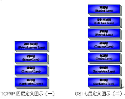 在網(wǎng)絡世界中計算機與計算機之間是透過特種協(xié)議來傳輸和溝通, 當今此協(xié)議是以TCP/IP (Transmission Control Protocol / Internet Protocol) 是由IETF (Internet Society's Internet Engineering Task Force) 根據(jù) DoD (Department Of Defense) 模型所制定的標準和 OSI (Open System Interconnection ) 是由ISO (International Standard Organization)所制定的標準, 下面三層偏硬件,上面三層偏軟件,中間一層偏軟件硬件間的溝通。兩種標準協(xié)議圖(一)和圖(二)來作簡單說明.