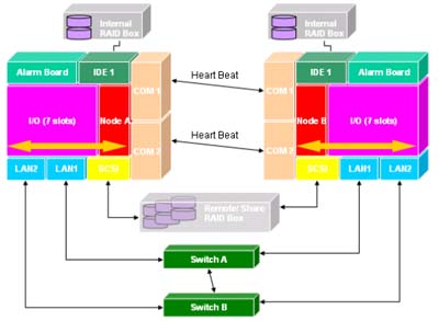 在網(wǎng)絡(luò)方面,上圖的兩臺CompactPCI系統(tǒng)各有兩個LAN,分別可透過Switch經(jīng)由防火墻連接到外部網(wǎng)絡(luò)。兩個Switch之間有網(wǎng)絡(luò)連通,且每個系統(tǒng)至少有兩個LAN可維持系統(tǒng)的網(wǎng)絡(luò)通暢。