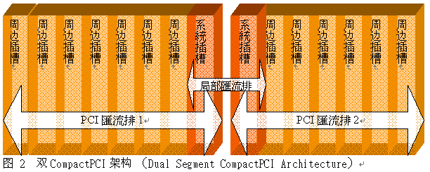 PICMG 2.0 CompactPCI系統(tǒng)是由一組或多組CompactPCI 總線所組成,每個總線最多可達8個CompactPCI板卡插槽,其中包含一個系統(tǒng)插槽(system slot)與最多達7個外圍插槽(peripheral slot)。PCI總線是作為該總線內插槽之間的主要通訊途徑,在這個架構下,PCI總線與系統(tǒng)插槽是一個可能的故障單點,故障的周邊插槽會讓整個PCI總線停止作用而阻礙了其它任一插槽之間的通訊。這種故障單點成為CompactPCI采用高可靠度應用的一個主要障礙,早期的CompactPCI 高可靠度系統(tǒng)架構必須克服PCI總線單點故障的限制,典型的解決方法則是添加第二個CompactPCI 總線且讓此二個總線的功能相同。圖2顯示雙CompactPCI 總線架構的范例。