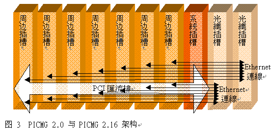 在2001年9月,PICMG協(xié)會核準PICMG 2.16 封包交換背板(Packet Switched Backplane)規(guī)格,本規(guī)格對于在一個CompactPCI架構里外圍插槽(peripheral slots)與光纖插槽(fabric slots)之間10/100/1000Mbit Ethernet的互聯(lián)做了詳細定義。光纖插槽是相互備援的,PICMG2.16兼容系統(tǒng)已被廣泛應用于多種用途上,Ethernet互聯(lián)與IP數(shù)據傳輸需求的普遍特性促使系統(tǒng)提供者廣泛采用此規(guī)格。圖3顯示典型的PICMG2.0與2.16架構。