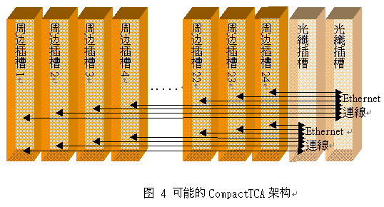 高可靠度CompactPCI 系統(tǒng)的下一步發(fā)展將是去除系統(tǒng)插槽(system slot);因為應用程序利用現(xiàn)今系統(tǒng)的IP互聯(lián),PCI總線逐漸成為派不上用場的費用。PICMG協(xié)會現(xiàn)正進行CompactTCA的規(guī)格制訂,CompactTCA規(guī)格可望結合AdvancedTCA(PICMG 3.0)所定義的系統(tǒng)管理能力、PICMG 2.0所定義的標準機箱(Form Factor)及PICMG 2.16所定義的數(shù)據傳輸。這種架構將不包含PCI總線,在此架構下的系統(tǒng)將能夠支持24個外圍插槽與2個光纖插槽。摒除PCI總線將可降低CompactPCI 系統(tǒng)所使用的電路板成本、降低提供備援系統(tǒng)插槽(system slot)的復雜性,以及增加插槽總數(shù)。圖4顯示可能的CompactTCA系統(tǒng)范例。