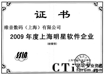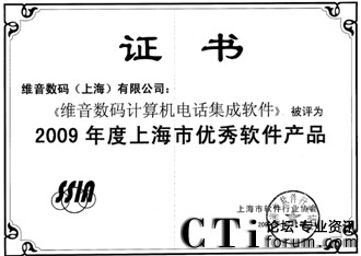 CTI論壇(ctiforum)10月19日消息: 金秋十月,捷報(bào)頻傳,由上海市軟件行業(yè)協(xié)會(huì)開展的2009年度上海明星軟件企業(yè)評(píng)選結(jié)果出爐,維音數(shù)碼不僅榮登:“2009年度上海明星軟件企業(yè)(經(jīng)營型)”和“2009年度上海明星軟件企業(yè)(創(chuàng)新型)”獲獎(jiǎng)榜單,維音數(shù)碼自主研發(fā)的軟件產(chǎn)品VisionCTI(計(jì)算機(jī)電話集成系統(tǒng))更是被評(píng)定為“2009年度上海市優(yōu)秀軟件產(chǎn)品獎(jiǎng)”。