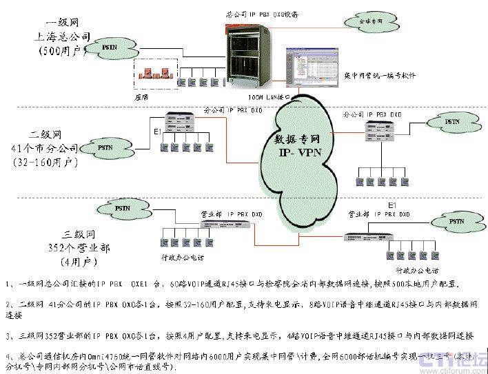 套Omni PCX Office(面向中小型機(jī)構(gòu)的通信平臺(tái))系統(tǒng)分別為4-160 用戶(hù)作為分支交換節(jié)點(diǎn)。全網(wǎng)總計(jì)多達(dá)6000