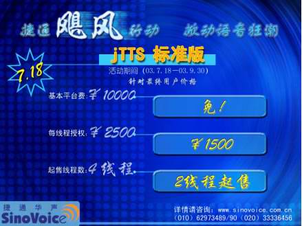 2003年7月18日,北京捷通華聲語音技術有限公司正式發(fā)布捷通華聲語音合成技術 “jTTS標準版”。為慶!癹TTS標準版”的正式上市,為期近三個月,推廣“jTTS標準版”的捷通“颶風行動”也在同一時間正式啟動! 捷通“颶風行動”的宗旨--用全新的產(chǎn)品、全方位的服務、最具競爭力的價格與所有CTI領域的企業(yè)合作,開啟面向中小型CTI系統(tǒng)語音應用的市場大門,為CTI產(chǎn)業(yè)發(fā)展提供持久動力支持!
