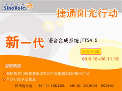 2006年8月18日,北京捷通華聲語(yǔ)音技術(shù)有限公司正式發(fā)布捷通華聲新一代語(yǔ)音合成系統(tǒng)jTTS4.5。為慶祝jTTS4.5的正式上市,同時(shí)也為回饋廣大用戶(hù),為期三個(gè)月,推廣jTTS4.5的捷通華聲“陽(yáng)光行動(dòng)”同步全面啟動(dòng)!