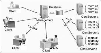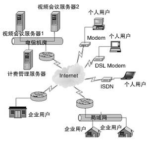 用戶可通過從56K撥號上網(wǎng)直至寬帶等各種方式接入該視頻會議系統(tǒng),包括PSTN撥號、ISDN撥號、ADSL撥號、LAN、PLC(低壓電力載波)等各種形式,在這個統(tǒng)一的視頻會議平臺上,實(shí)現(xiàn)多路音頻、多路視頻、文檔共享、電子白板、協(xié)同瀏覽、文件傳輸、文字交流等功能。系統(tǒng)的拓?fù)浣Y(jié)構(gòu)圖如左所示。