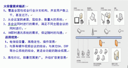 太平洋保險集團(tuán)下根據(jù)業(yè)務(wù)模式劃分為產(chǎn)險、壽險2個公司,每個公司在全國各省都有分公司,目前集團(tuán)公司管理著主服務(wù)器,每個分公司都有自己的從服務(wù)器,總計60余臺從服務(wù)器,應(yīng)用的交互點(diǎn)數(shù)1000點(diǎn),旁聽點(diǎn)數(shù)300點(diǎn)。保險行業(yè)銷售人員流動快、各種培訓(xùn)頻繁、新險種推出層出不窮,其中省分公司、眾多支公司與銷售網(wǎng)點(diǎn)人員的即時音視頻交流是重中之重,為了滿足客戶要求系統(tǒng)平臺支持大容量會議人數(shù)、多會議同時召開以及流暢的音視頻交換的要求,國際視訊知名廠商北京威速科技有限公司專門為大企業(yè)級用戶開發(fā)出了高性能大容量的視頻會議產(chǎn)品。這種更適用組織機(jī)構(gòu)龐大、更穩(wěn)定的純軟件網(wǎng)絡(luò)視頻會議平臺,是迄今為止業(yè)內(nèi)唯一勝任單會議室同時容納千人以上用戶開會,并支持無限量會議室,并且通過級聯(lián)技術(shù)可以同時支持幾千路音視頻交互并發(fā),同時實(shí)現(xiàn)一個集視頻交互、音頻交互、屏幕廣播、遠(yuǎn)程控制、文字交流、電子白板、文檔共享、文件傳輸?shù)榷囗?xiàng)功能于一體的綜合多媒體遠(yuǎn)程會議平臺。自V2 conference應(yīng)用以來,承擔(dān)了公司絕大部分遠(yuǎn)程交流任務(wù),太平洋保險集團(tuán)已把視頻會議交流當(dāng)作工作的一部分,成為工作之必須的習(xí)慣。極大地提高了企業(yè)運(yùn)作效率、降低了成本,而這些正是金融保險機(jī)構(gòu)的制勝之道。