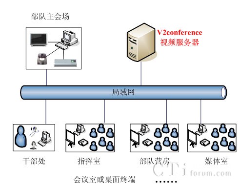 V2視頻會(huì)議系統(tǒng)建立在森警部隊(duì)專(zhuān)網(wǎng)的基礎(chǔ)上,各區(qū)作戰(zhàn)部隊(duì)會(huì)議室、指揮室和部隊(duì)營(yíng)房會(huì)議均為光纖100M接入,每個(gè)中隊(duì)官兵營(yíng)房都集中建立了培訓(xùn)會(huì)議室,負(fù)責(zé)日常新兵的培訓(xùn)教育。在現(xiàn)有的網(wǎng)絡(luò)基礎(chǔ)上構(gòu)建了V2視頻會(huì)議系統(tǒng),來(lái)滿足各個(gè)中隊(duì)和教導(dǎo)大隊(duì)的網(wǎng)絡(luò)會(huì)議和培訓(xùn)需求。在每個(gè)節(jié)點(diǎn)會(huì)議室部署了電視、攝像頭和相關(guān)音響設(shè)備,目前已經(jīng)建成10多個(gè)網(wǎng)絡(luò)會(huì)議節(jié)點(diǎn)的遠(yuǎn)程視頻培訓(xùn)系統(tǒng)。
