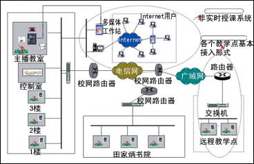 在進(jìn)行項(xiàng)目設(shè)計(jì)時(shí),采用了硬件平臺(tái)和軟件平臺(tái)相結(jié)合的方式;在通信方式上采用“天地合一”的模式,并遵循交互性、互動(dòng)性、低投入、整合、共享共建的原則;并且,采用了開放性的網(wǎng)絡(luò)技術(shù)。目的在于通過地面網(wǎng)絡(luò),將全省14個(gè)地市中心連接起來,以電教館為中心、以浙江師范大學(xué)和浙江教育學(xué)院為骨干學(xué)校,先期將教師的再繼續(xù)教育為主要目標(biāo),通過地市的中心遠(yuǎn)程教學(xué)點(diǎn)積累大量的教育資源,作為開展浙江省遠(yuǎn)程基礎(chǔ)教育的堅(jiān)實(shí)基礎(chǔ)。
