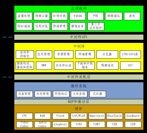 第三個中間件的可移植性可擴展性。芯片廠家或第三方廠家提供的解決方案主要包括:硬件解決方案;實時操作系統(tǒng)層,包括了設(shè)備/網(wǎng)絡(luò)驅(qū)動、文件系統(tǒng)、圖形/字體驅(qū)動、網(wǎng)絡(luò)協(xié)議;瀏覽器模塊,其他模塊需要機頂盒制造廠家進行研發(fā),而這些正是競爭差異和難度所在。產(chǎn)業(yè)要做大,就需要更多的廠家進入。理想的中間件客戶端基于操作系統(tǒng)層和硬件;使得更多的缺乏固網(wǎng)技術(shù)經(jīng)驗的廠家能夠加入到機頂盒產(chǎn)業(yè)鏈中,專注于機頂盒基礎(chǔ)研發(fā)和生產(chǎn),使得中間件移植的難度最小、時間最短