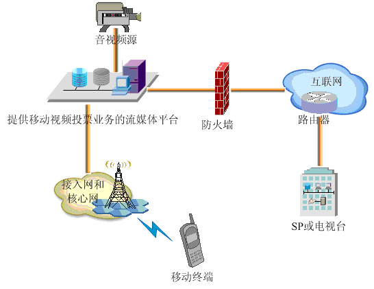 移動流媒體系統是移動視頻投票的中樞模塊,音視頻輸入源直接將音視頻信息傳送到移動流媒體平臺,由移動流媒體平臺分發(fā)到視頻投票手機,讓用戶觀看現場音視頻狀況。視頻投票手機通過按鍵操作向移動流媒體平臺發(fā)送投票指令,移動流媒體平臺將投票指令發(fā)送給SP或電視臺完成投票,并根據投票是否被SP或電視臺接受從而完成計費。移動流媒體平臺還會被動從SP或電視臺獲取選手介紹等文本信息、投票統計信息等,然后將這些信息顯示在視頻投票移動終端上。
