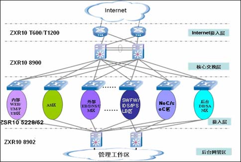 其中Internet接入層為保證線速轉(zhuǎn)發(fā),大容量(路由表、MAC等)和高可靠性,建議采用ZTE的高端核心路由器ZXR10 T600兩臺。核心交換層網(wǎng)絡(luò)的基本要求是:高可擴展性、以太網(wǎng)端口密度高,大容量(路由表、MAC等)、高可靠性(全冗余結(jié)構(gòu))、和支持二層/三層VLAN和STP、PVST、802.3ad 、VRRP等等關(guān)鍵技術(shù)。ZTE提供的ZXR10 8900系列萬兆MPLS路由交換機完全滿足這些要求。它具有多個業(yè)務(wù)插槽,最大提供2880 Gbps的交換容量和2143Mpps的包轉(zhuǎn)發(fā)能力,支持多個萬兆接口或千兆接口,并且能夠提供豐富的業(yè)務(wù)功能。接入層建議采用中興ZXR10 5228/5252全千兆交換機,用高速ASIC交換芯片實現(xiàn)L2和L3數(shù)據(jù)線速轉(zhuǎn)發(fā),提供完備的以太網(wǎng)協(xié)議族支撐和高效的QOS優(yōu)先級機制,具備靈活多樣的管理手段。ZXR10 5200提供高密度的GE光/電端口和10GE接口,能夠很好的完成數(shù)據(jù)中心中服務(wù)器接入的工作。