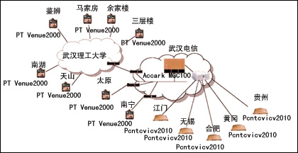 武漢理工大學(xué)的遠(yuǎn)程教學(xué)系統(tǒng)由于分2期建設(shè),網(wǎng)絡(luò)條件較為復(fù)雜。一期主要以PT的Venue2000終端+Accord MGC100 MCU為主,是H.323系統(tǒng);二期采用Penteview2010終端+Penteview6088MCU,是H.320系統(tǒng),此案例是國(guó)內(nèi)首家教育行業(yè)H.320與H.323混合組網(wǎng)方式的視頻電視遠(yuǎn)程教學(xué)網(wǎng)。各教室均采用了中太數(shù)據(jù)的遠(yuǎn)程教學(xué)中控系統(tǒng),整個(gè)組網(wǎng)采用星型結(jié)構(gòu),2010和6088之間采用512k的DDN專(zhuān)線連接,其中,384k用于傳輸視頻、音頻,128k用于傳輸T.120數(shù)據(jù)。2010設(shè)備及其標(biāo)準(zhǔn)外設(shè),加上符合遠(yuǎn)程教育功能需要的其他外設(shè),構(gòu)成遠(yuǎn)程教育網(wǎng)絡(luò)專(zhuān)用教室的設(shè)備配置。